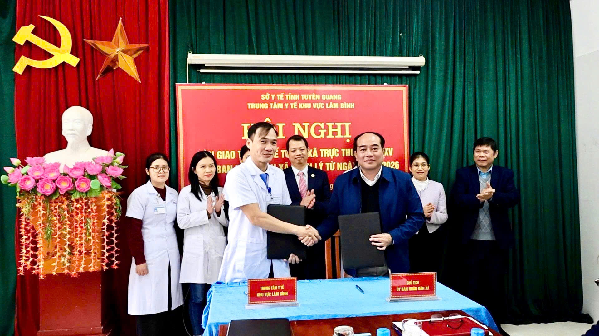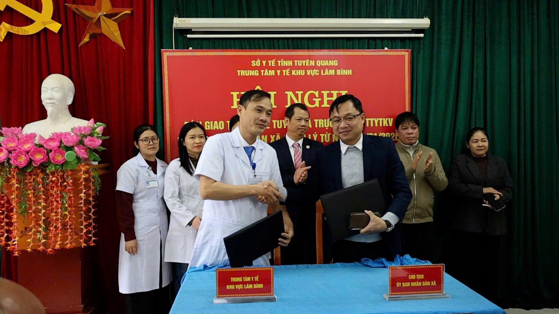 Lãnh đạo Trung tâm Y tế khu vực Lâm Bình và lãnh đạo Uỷ ban nhân dân các xã Lâm Bình thực hiện bàn giao Trạm y tế xã