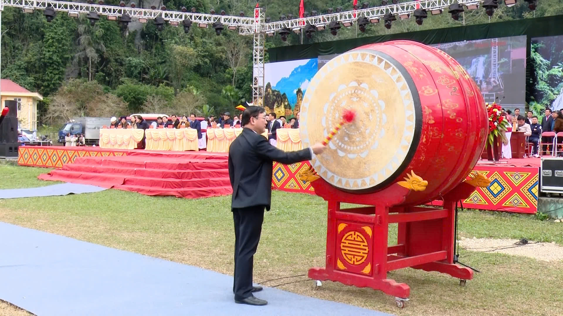 Đồng chí Lê Thế Đạt, Uỷ viên Ban Thường vụ Huyện uỷ, Chủ tịch UBND huyện đánh trống khai hội